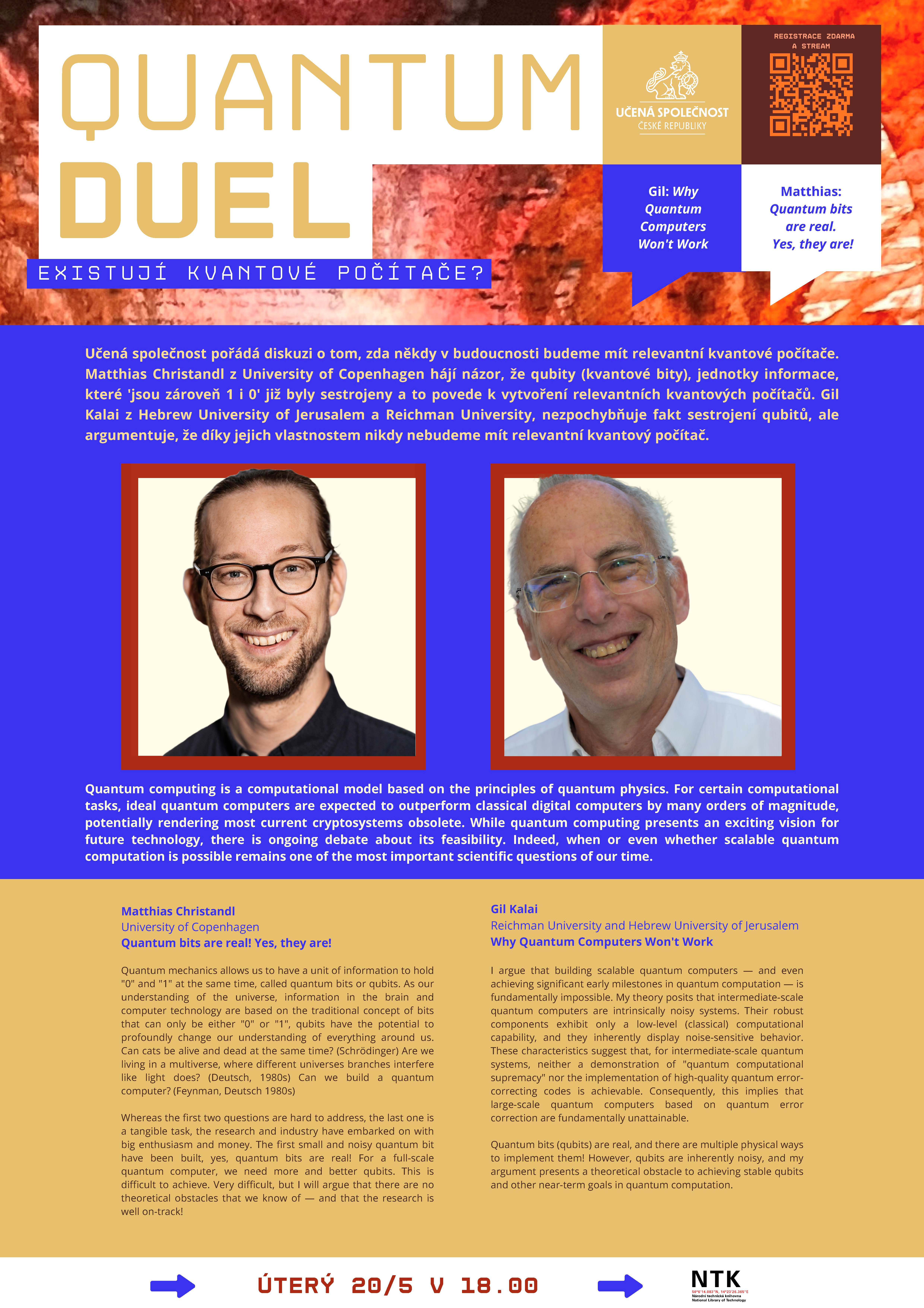 Učená společnost České republiky pořádá diskusi o tom, zda někdy v budoucnosti budeme mít relevantní kvantové počítače. Matthias Christandl hájí názor, že qubits (kvantové bity), jednotky informace, které „jsou zároveň 1 i 0“, již byly sestrojeny, a to povede k sestrojení relevantních kvantových počítačů. Gil Kalai nezpochybňuje fakt sestrojení qubitů, ale argumentuje, že díky jejich vlastnostem nikdy nebudeme mít relevantní kvantový počítač.