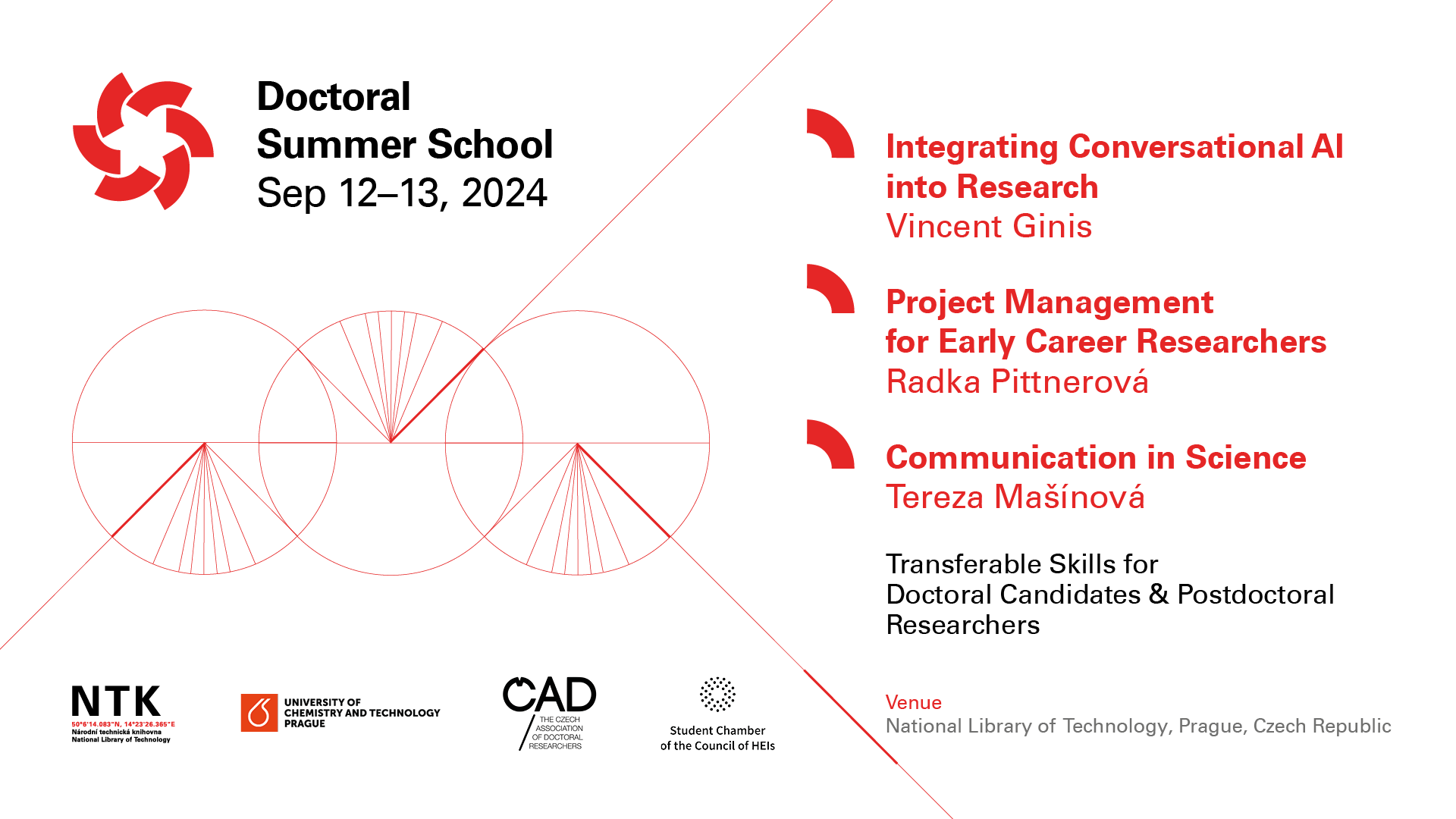 The National Library of Technology (NTK) is proud to announce the third Doctoral Summer School for Early Career Researchers. The event will take place on September 12–13, 2024 in Prague and is organized by NTK in collaboration with the University of Chemistry and Technology in Prague (UCT Prague), the Czech Association of Doctoral Researchers (ČAD), and the Committee for Doctoral Studies under the Student Chamber of the Council of the Higher Education Institutions (SK RVŠ).